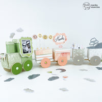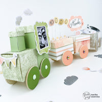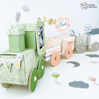 1. La cabina di guida, che ho decorato con la foto di Chiara e Matteo, si compone di 3 scatole: la prima misura 5 cm x 5 cm, quella più grande misura 5 cm x 10 cm. In una piccola scatola da 2 cm x 4 cm, ho fatto passare il *Copper wire argento* su cui ho attaccato due nuvole che fanno parte dei *Die-cut dream big little one* per emulare l’effetto “vapore”.