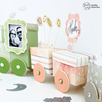 Le ruote sono realizzate con il cerchio più piccolo delle *Dashing circles* e il *Cartoncino vegetale da 1mm* e le ho unite da un bastoncino di legno che ho attaccato sotto le scatole con la colla a caldo.