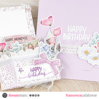 Infine, ho ritagliato due rettangoli dalla fustella *dashing rectangles* che ho incollato sull’aletta sporgente per attaccare una foto ricordo. Così la mia birthday card si è anche trasformata in una birthday card porta foto!