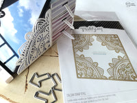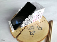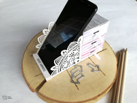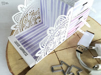 Ho poi fustellato dal *Cartoncino Woodstock Bianca* con la fustella *Oriental Card*. Ho tagliato in due parti al centro e ho creato le sponde per il mio porta cellulare, incollando sulle alette un rettangolo piegato a metà.