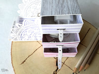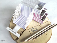 Con la fustella *Matchbox* ho fatto tre cassetti utilizzando la collezione di carta double-face *Wooden Colors 01* dalla parte dell’acquerello viola e prima di sigillare con la colla, ho inserito un pezzettino del laccetto della fustella *Matchbox Suitcase Add-on* nel foro, per aprire il cassetto. Infine li ho poi fasciati tutti e tre sempre con la stessa carta dal lato effetto legno.