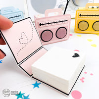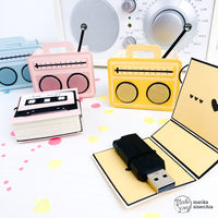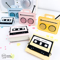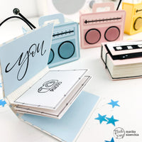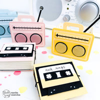 Per la base ho usato le nostre double-face nel *Pastel Pink*, *Pastel Blue* e *Pastel Yellow*. Con le *Antique Rose*, *Dusty Blue* e una variante più scura del giallo ho fustellato la base della scatolina che ho posizionato sotto le casse della radio e ho tagliato delle piccole strisce da 2 mm per fare i contorni.
