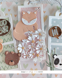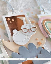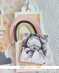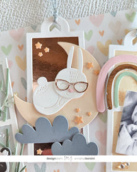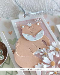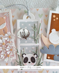 Poi ho decorato ogni tag con degli animaletti diversi delle fustelle della collezione: leopard & bear e comic strips nella prima tag a fondo verde, fox e animal body per la seconda tag a fondo rosa, panda e comic strips per la terza tag a fondo azzurro, rabbit e moon card per la quarta tag a fondo oro rosa (secondo me il coniglio sulla luna è troppo tenero), koala (di cui ho usato solo l’arcobaleno) per la quinta tag a fondo giallo, in questa tag l’animaletto è la mia nana.