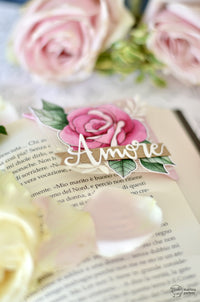 Per finire ho ottenuto un piccolo banner dai fogli *Kraft* e sopra di esso ho applicato la scritta *Amore*, ottenuta dall'omonima fustella.