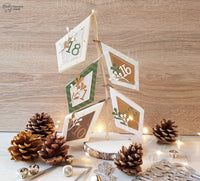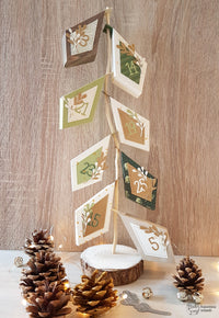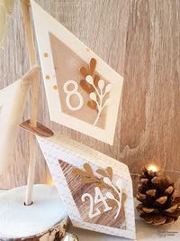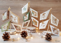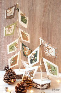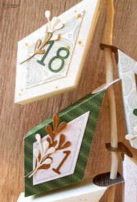 Ho creato le *Prism Frame Box* usando le carte della collezione *Forever Green*, ma anche del semplice cartoncino bianco su cui ho aggiunto una nevicata di *Gelly Gold* con l’aiuto dello *Stencil Snow*. Ho abbellito con i rametti della fustella *Mistletoe Wreath*, usando la carta *Special paper kraft oro opaco*, e per completare ho aggiunto i numeri realizzati con la fustella *Funny Alphabet*.