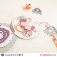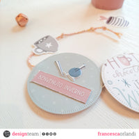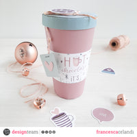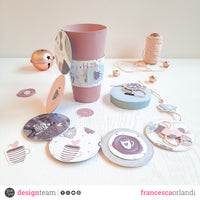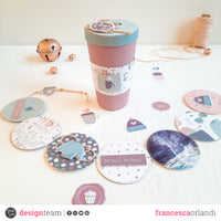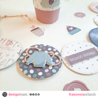 Per realizzarlo ovviamente ho usato la nuova fustella “Take a Brake” e i cartoncini della Color Palette “Cuddle Time” per creare il bicchiere, poi, per fare l’albumino di 7 paginette, fustello 14 “Dashing Circles” (misura 5,8) usando sia delle fotografie, sia la collezione “Cuddle Time” 12x12 cm, e incollo i cerchi ottenuti a due a due lungo un filo. Infine decoro le pagine con i Puffy Stickers e i Die Cut “Cuddle time”.