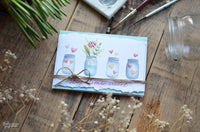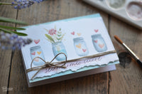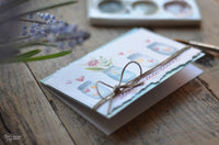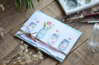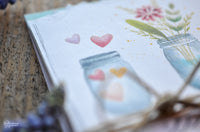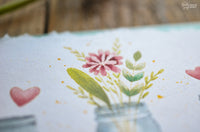 Per realizzare questo progetto ho usato pochissimi ma bellissimi elementi. Innanzitutto ho tagliato un rettangolo di cartoncino *Sirio White* che è perfetto per la colorazione con colori acquarellabili. Per colorare i vasetti di fiori del set *Ti Penso* ho usato la tecnica del no line e di conseguenza per timbrare ho utilizzato l'Antique Linen dei Distress Ink.