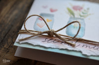 Come ultimo passaggio, ho per prima cosa strappato i lati lunghi del rettangolo con i fiori, per creare l'effetto rovinato, e dopo averlo incollato con del biadesivo spessorato, ho creato con del semplice spago un nodo che va a completare la mia card.