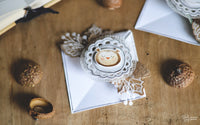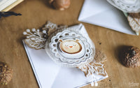 Le decorazioni che invece circondano i personaggi sono realizzate con due set di fustelle, nello specifico il set *Winter Grenery* ed il set realizzato in collaborazione con Tommaso Bottalico *Caldi Abbracci*. Per realizzarli ho usato la carta *Kraft* ed il *Vellum* (le pigne sono realizzate sempre in carta Kraft invecchiata però con i distress ink).