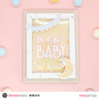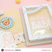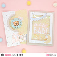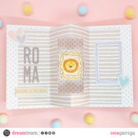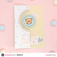 Successivamente, mi sono concentrato sulla figura dello spinner, un adorabile orsetto realizzato con i timbri Postage New Baby che ho incluso all'interno di una delle fustelle Postage bits. Per ottenere l'effetto spinner ho dovuto fare la figura due volte e prima di incollarli insieme ho aggiunto una lenza al centro. Ho incollato questo stesso filo sulla copertina (sia in alto che in basso) e infine ho aggiunto una sovracopertina in modo che il filo non si vedesse oltre il cerchio. Infine ho decorato l'esterno con la meravigliosa fustella Hello Baby Sentiment e l'interno con diversi die cuts della collezione New Baby (sia Boy che Girl).