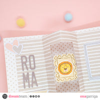 In questa copertina, realizzata anche con le carte della collezione New Baby, ho realizzato uno shaker con la fustella Happy Frame e all'interno ho messo la fustella Hello Baby Sentiment, ottenendo così una card con maggior volume e vistosità. All'interno della cartolina, ho realizzato lo spinner seguendo la stessa procedura della cartolina precedente: timbrare e colorare la figura, farne una copia e agganciare entrambe le figure con una lenza al centro. Infine ho decorato il resto della cartolina con il nome della neonata, Roma, e la fustella di una cornice della collezione New Baby dove poi aggiungerò un'immagine della bambina.
