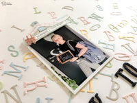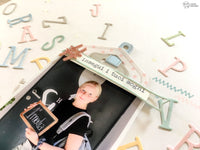 Con il *Gelly* ho abbellito alcuni caratteri in modo che risultassero un pò più brillanti tra le varie lettere. Con le nuove fustelle *Hanging Tag* ho creato uno sfondo per la foto della mia Emma, che ha appena iniziato la prima media.