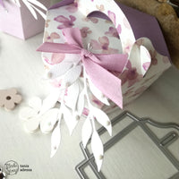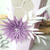 Per decorare la parte frontale della scatolina ho utilizzato la fustella “Echinopsis Flower” e ho composto il bellissimo fiore nei toni del lilla e al centro ho incollato una mezza perla. Sul lato, legato alla maniglia di chiusura della scatolina, ho legato un filo e appeso una piccola tag, fustellata dalla plancia “Shopper” e una piccolissima nappina coordinata con le carte.