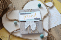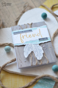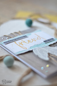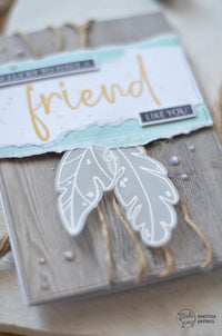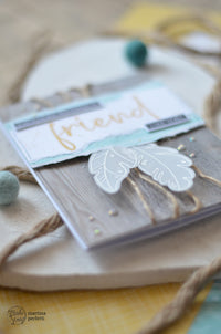 Per quanto riguarda i timbri invece, i set che ho utilizzato sono i seguenti: *Piume*, realizzate stampando l'immagine sul semplice vellum, per dare un senso di leggerezza; *Friends*, dal quale ho preso il mio sentiment principale, adoro la scritta grande, e stampata colorata, ha una definizione stupenda; infine, il set *Best Friend Forever*. dal quale ho preso il sentiment che ho stampato all'interno della card e sulla busta.