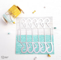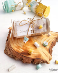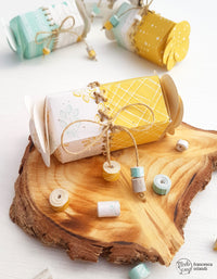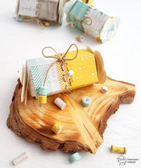 Ho fustellato questi “nuovi” fogli bi-color con la fustella *Sugar Candy Box* un vero must have di questa Primavera, facendo in modo che la linea di unione delle due fantasie fosse a metà della fustella. Poi sempre lungo questa linea di unione ho fustellato i forellini usando la fustella *Deco Lines* e ho creato le diverse cuciture usando della corda sottile.