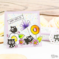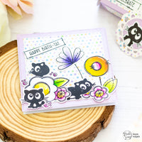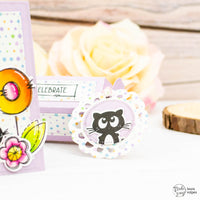 Le immagini che ho scelto fanno parte dei set Doodle Flower e Funny Cat. Li ho timbrati con un tampone nero resistente all'alcool e ho colorato i fiori con i pennarelli Spectrum Noir Illustrator. Ho poi tagliato il tutto con le forbici e con le fustelle Doodle Flower.