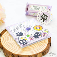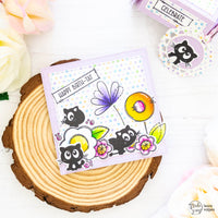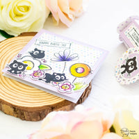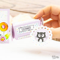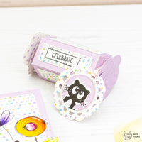 Ho poi creato due banner per i miei sentiment con i timbri nel set Postage Celebrate. Li ho ritagliati e li ho incollati alla card e alla scatolina. Per finire, ho realizzato una mini tag con le fustelle Postage Bits e le Dashing Circles. Ho incollato uno dei gattini al fronte della tag, che ho poi fatto aderire alla scatolina con del twine e un glue dot.