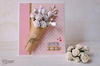 Il bouquet delle rose è stato fatto con un semplice quadratino di carta da pacchi che ho arrotolato; dentro ho infilato dei fiori che avevo e ho aggiunto un paio di rametti in bianco e rosa e via, un goccio di colla a caldo per incollare tutto!