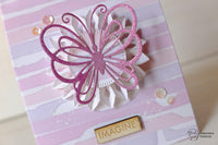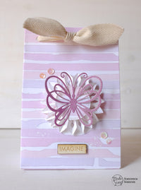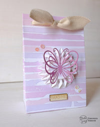 L'ho realizzato con una carta deliziosa della collezione "Land of Fairies" e poi l'ho decorato applicando, sopra ad una coccarda, un cerchietto e la farfalla di ModaScrap "Butterfly" tagliata su carta glitter. Qualche schizzo di gesso bianco e delle paillettes e il pack è pronto!