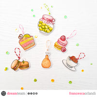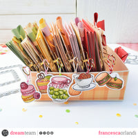 Queste scritte le ho fatte con la fustella “Alphabet Stickers”. Alle pinzette ho aggiunto dei charms colorati ad acquerello realizzati con i timbri e le fustelle coordinate “Cucina With Love”: con un pò di fantasia ho fatto diventare i macarons dei mini hamburger con oliva, la tazza è diventata un piatto di pasta e ho riempito il barattolo di pisellini verdi.