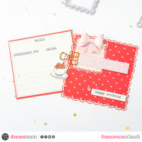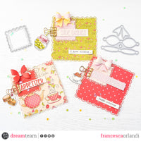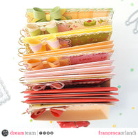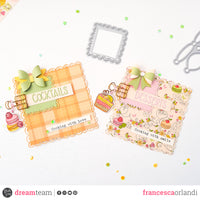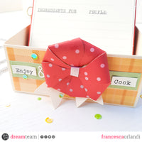 Per realizzarla ho scelto la coloratissima collezione di carta “Cucina With Love” e con la fustella “Scallop Squares” ho ricavato i divisori per i diversi tipi di piatti: la misura 10,5x10,5 cm l’ho usata per la base che ho rinforzato con il cartonino vegetale da 1mm, mentre ho usato la misura più piccola (5,5x5,5 cm) come se fosse una tag su cui ho pinzato le scritte antipasti, primi, secondi, ecc.