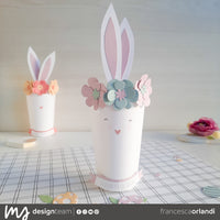 Le orecchie le ho ritagliate a mano e incollate dentro la fessura del coperchio. Per il nasino ho incollato il cuoricino della fustella “Buona Pasqua”, mentre gli occhietti li ho disegnati con un marker nero sottile.