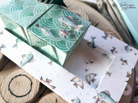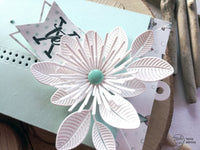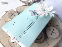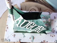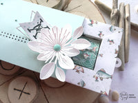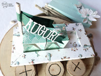 Per chiudere la card, e quindi le magic box schiacciate dentro la cornice, l’ho avvolta con una patterned Double Face “Pastel Green” precedentemente fustellata con la “Deco Lines” creando una fascia ed infine decorata con la “Branch 9” e la “Dream Flower”. Ho timbrato il sentiment della placca della linea Tommy “T.V.B.” sul “Banner” della misura più grande.