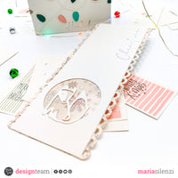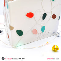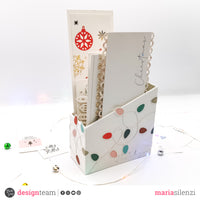 Non ho rivestito questo pezzo, ma lo ho decorato con una fustella che trovo davvero carina, Happy lights. Ho utilizzato la carta a onde colorate della collezione Magic of Christmas per riempire le lucine. In basso a destra ho aggiunto il rub on “Holidays” con il foil argento. Ed ecco che in maniera molto semplice ne è venuto fuori un bel porta tag e card che diventa un homedecore da scrivania.