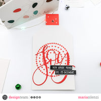 Dato che c’ero ho realizzato anche una card, una tag e un segnalibro. Per la card ho utilizzato la fustella Eucalyptus, il vellum Winter Time 02 e un sentiment strips oro. Per la tag ho usato la fustella Creative Circles per creare lo sfondo a cui ho sovrapposto la fustella Big Joy.