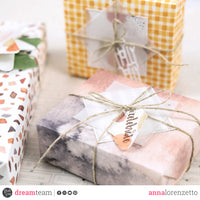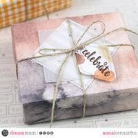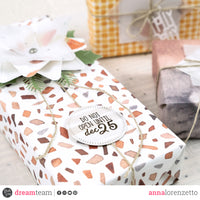 Per i pacchetti più piccoli invece, ho fustellato dei quadrati di vellum e carta pattern, utilizzando il set Dashing Squares, e li ho incollati al centro della confezione, sovrapponendoli. Ho quindi completato le decorazioni con due tag: uno realizzato con il set Christmas Charms e l’altro con la fustella Diamond Tags (la stessa dei petali) e un sentiment del set Time to Celebrate.