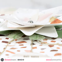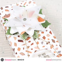 Per abbellire la scatola più grande ho creato un fiore in carta, combinando la fustella Diamond Tags per i petali e la fustella Christmas Greenery per la base. Ho quindi fustellato 16 petali (4 da un foglio di Vellum Hexagons Holographics, 4 con una fantasia del Paper Pack Wanderlust e 8 da un foglio di cartoncino bianco), li ho leggermente arricciati verso i bordi e li ho uniti assieme con un ferma campione, sfruttando il foro presente su una delle loro estremità.