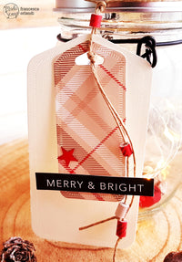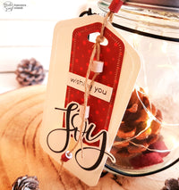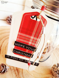 Per le tag ho usato le due misure più piccole della fustella ]Hanging Tag* e la collezione di carta *Sudtirol Origins*, ho aggiunto le scritte bianco su nero di questa collezione e anche le timbrate “make e WISH” del set *Wishes* e la timbrata “wishing you JOY” del set *Joy*.