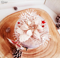 Prima di tutto, mi sono procurata queste lanterne luminose (in questo periodo si trovano sia on line che nei centri di giardinaggio), poi, usando la fustella *Dashing Circles*, ho creato la base su cui ho incollato il bouquet realizzato con la fustella *Winter Greenery*: ho optato per dei colori bianchi caldi, quindi ho usato il *Cartoncino Woodstock Betulla* abbinata al *Cartoncino Argento Specchio*, al cartoncino kraft, e al Bazzil Twig.
