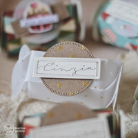 Una volta assemblati tutti gli elementi, ho deciso quali sarebbero diventati dei segnaposto e con un pennarello dalla punta fine ho scritto i nomi degli invitati. Come ultimo tocco, ho aggiunto delle gocce di Nuvo Drops.