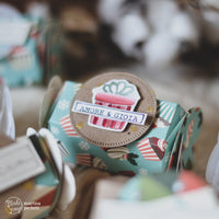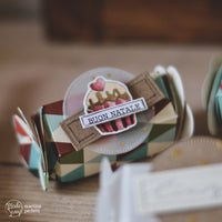 Una volta fustellate ed assemblate le scatoline, ho timbrato e colorato alcuni elementi del set di timbri *Postage Celebrate* utilissimo, non solo da usare per i compleanni, ma anche per Natale, infatti i piccoli cupcakes si abbinano perfettamente alla fantasia del pad di carte utilizzato per la base delle scatoline.