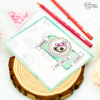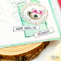 Ho creato i sentiment utilizzando timbri dal set Postage Celebrate e ho incollato tutto alla base della card. Come ultimo step ho aggiunto delle gemme rosa attorno al punto focale della card.