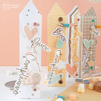 Farle è semplice: ho fustellato la scatolina e prima di chiuderla ho forato e applicato gli eyelets sia in alto che in basso. Poi ho inserito lo spago, e ho infilato i vari DIE CUTS sia in versione NEW BABY GIRL sia in versione NEW BABY BOY.