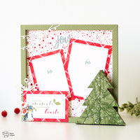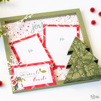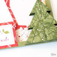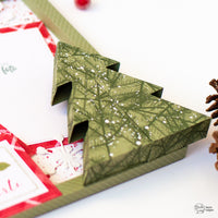 Per l'albero ho utilizzato la fustella *Christmas Tree Box* e la carta con gli aghi di pino, ho aggiunto poi delle goccioline bianche con il Fluffy nel colore Brilliant White. In questo modo ho creato l'effetto di una nevicata e ho aggiunto un pò di glitter al progetto.