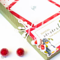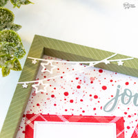 Per la cornice ho utilizzato la fustella Happy Frame e una delle carte della collection Xmas LE. Una volta assemblata la cornice, ne ho foderato il retro con un foglio di carta patterned dallo stesso pad. Ho scelto quello con le macchiette rosse, perché mi fa pensare alla neve e aggiunge un bel tocco di colore allo sfondo.