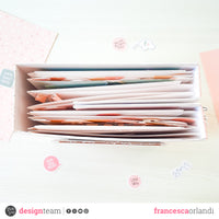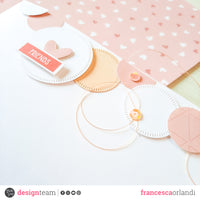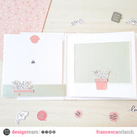 L’album misura circa 23 x 23 x 9 cm e per realizzarlo ho scelto la collezione “Love is in the Air” abbinate alle carte Double Face Pastel Blush, Spring Rose e Eucalyptus: mi piace la delicatezza dei colori e del design.