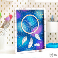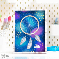 Per la parte centrale, che di solito viene intrecciata con del filo o dello spago, ho optato invece per l'utilizzo di una penna gel bianca. Ho tracciato un cerchio direttamente sullo sfondo col cielo stellato e l'ho diviso in 16 sezioni. Con l'aiuto di una fustella circolare ho poi disegnato il pattern all'interno del cerchio.