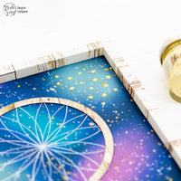 Ho iniziato creando quello che sarà lo sfondo del nostro quadro. Ho preso un foglio di carta da acquarello tagliato alla misura di circa 27x20 cm e ho creato un galaxy background con i Distress Oxide e la tecnica dell'ink blending. Ho utilizzato i colori Black Soot, Blueprint Sketch, Peacock Feathers, Cracked Pistachio, Picked Raspberry e Wilted Violet. Ho poi creato le stelle con i Gansai Tambi Starry Colors e il Fluffy in Brilliant White.