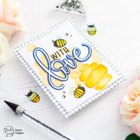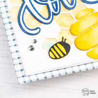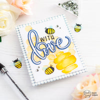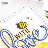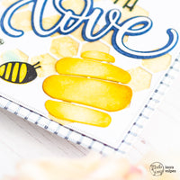 Il sentiment è stato creato con le fustelle Big Love e Alphabet Stickers. Si accostano benissimo e adoro il fatto che si possano usare le fustelle Stickers Dies per personalizzare qualsiasi progetto! Per l'alveare e le api ho usato le fustelle Bee Sweet - un altro bellissimo set dell'ultima release!