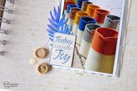 Ho abbinato anche degli acquerelli al bazzil bianco e ho colorato con i miei pennarelli ad alcol alcuni pezzettini di carta che poi ho fustellato con i Rametti di ModaScrap in modo da creare le cromie perfette.