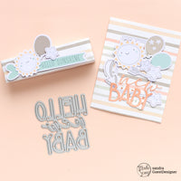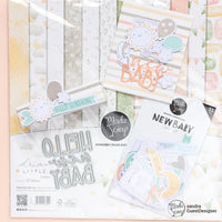 Così, ho deciso di creare due card e due piccole confezioni usando le fustelle *Frangipane*, *Treat Holder*, *Hello Baby Sentiments*, i die cuts della collezione *New Baby* e le carte della collezione *Dream Big, Little One*.