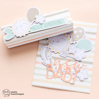Il secondo progetto, invece, è pensato per una nascita e per questo ho utilizzato alcuni prodotti della Release di giugno, questa volta ho scelto una carta dal pack *Dream big, little one* che ho fustellato sempre con la *Treat Holder*, assemblato la scatolina e decorata con alcuni die cuts della collezione *New baby* sul tiffany. Per la card abbinata, ho aggiunto una scritta dal set *Hello baby sentiments*.