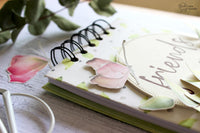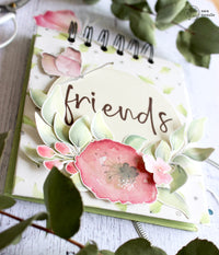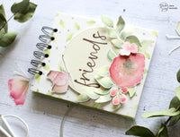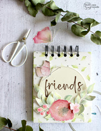 La scritta "friends", che può essere utilizzata anche al singolare, grazie alla "s" staccata, è del set di timbri *Friends*, ed è timbrata su un cerchio ottenuto dalla fustella *Dashing Circles* da un pezzetto di *Carta Woodstock Betulla*, che, ti avviso, è il mio mai-più-senza dell'anno, è bellissima, ha una buona grammatura che quindi si presta a diversi scopi ma soprattutto a colpo d'occhio potrai notare che nell'impasto della carta sono dispersi dei piccoli pezzi di legno che rendono ogni foglio diverso e sicuramente più interessante.