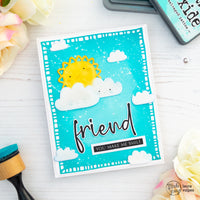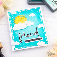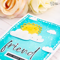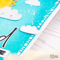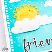 Ho poi fustellato il sole e l nuvolette dal set New Baby e ho aggiunto colore con i Distress Ink nei colori Squeezed Lemonade, Dried Marigold e Salty Ocean. Ho incollato le fustellate alla card e le ho ricoperte prima con una penna glitter e poi con i Glossy Accent.