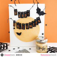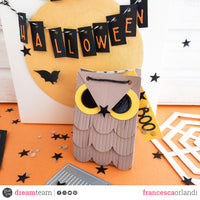 Ho fatto anche una borsetta sulla quale ho messo la scritta Happy Halloween (fustella Alphabet Stickers) e una grande luna gialla realizzata fustellando il cartoncino vegetale da 1mm con la fustella Dashing Circles, e poi l’ho ricoperta con il Fluffy nel color Sunshine.