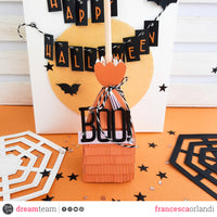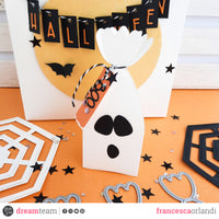 La scopetta, il fantasmino e il ragnetto sono fatti usando la fustella Cupcake Box: in particolare per i primi due ho usato solo una fustellata della Cupcake Box, infatti hanno solo tre facciate, ho ricavato la base dividendo l’esagono in sei triangoli. Per il ragnetto invece ho creato la scatolina completa e ho aggiunto del twine bianco e nero avvolto intorno al Copper Wire Silver per le zampette.